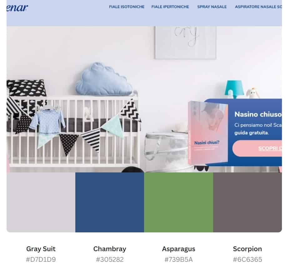 We adore this beautiful royal purple with Hex #6644A2. The palette generator picked up the soft Cadet Blue (#A0A7BC) but failed to grab the brighter blue hues on the CTA and text. Keep in mind you can add accent colors or vary the shade of each color you’re using in a scheme.