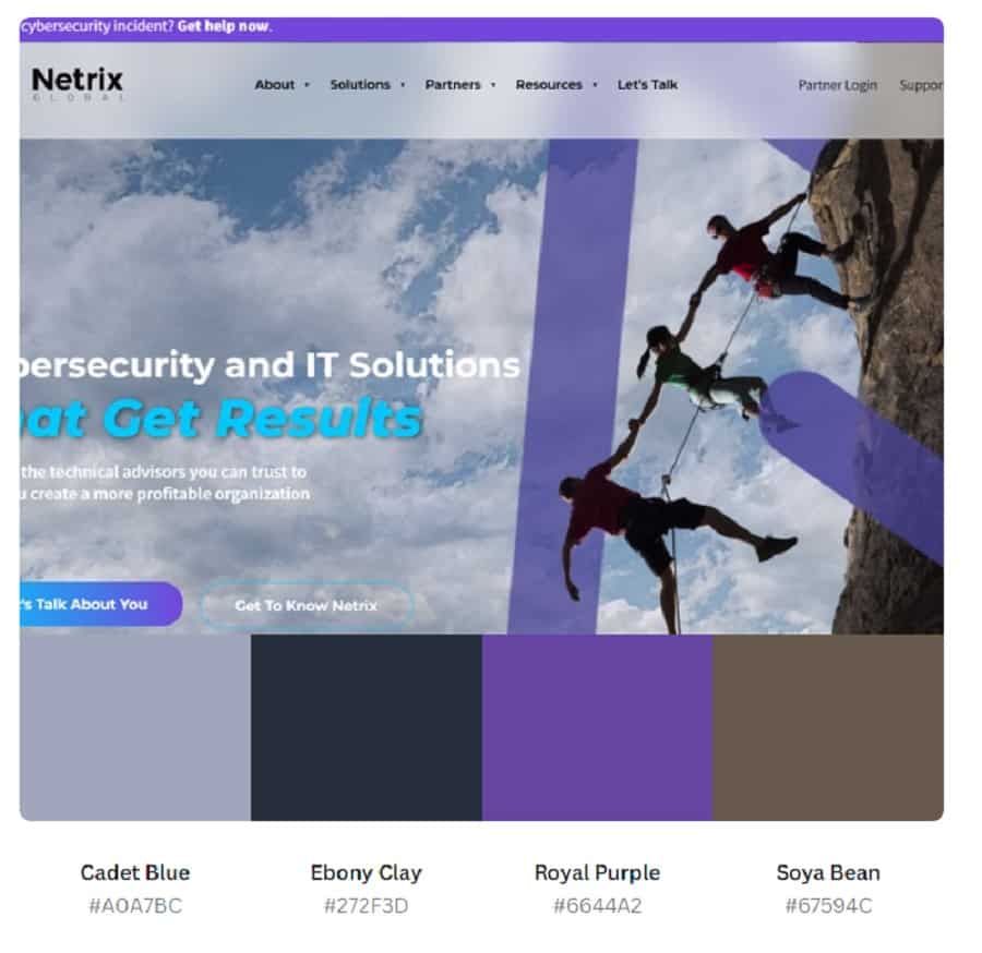 Netrix grabs several shades of blue and a bright pop of purple for a gorgeous analogous color scheme that pulls the user in. Note how the CTA button has a gradient that starts with a bright blue and moves into deeper blue and then a pop of purple on the right edge.