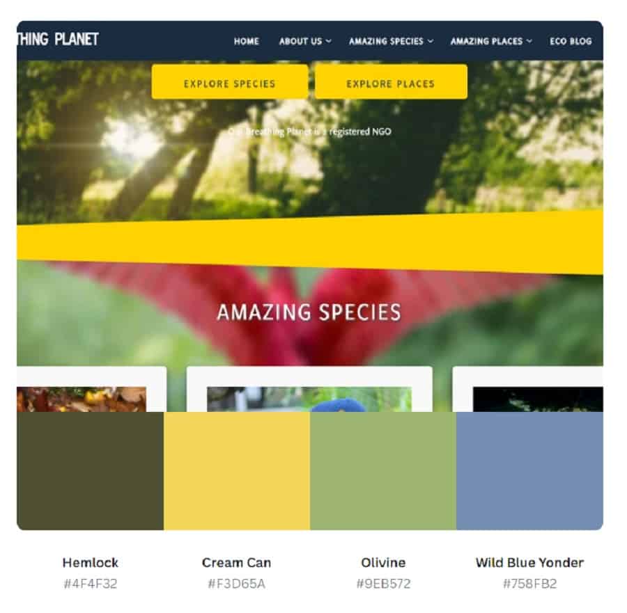 It isn’t easy to find a website design with the colors orange, yellow and green. While they do sit next to one another on the color wheel, they don’t have the punch of, say, red and purple. We like the effect of this color combination for Our Breathing Planet because it gives a sense of nature.