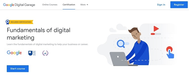 In this “Fundamentals of Digital Marketing” course, you’ll go through 26 modules over about 40 hours. It is an excellent course for beginners, with video tutorials and self-paced learning. Once you complete your studies and take a final exam, you’ll get a Google certification.