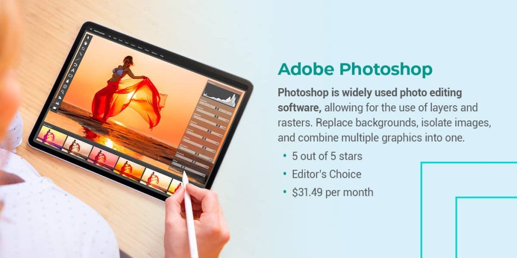 Illustrator is another popular and widely used photo editing software tool. It allows the use of layers and rasters. Replace backgrounds, isolate images, and combine multiple graphics into one image.