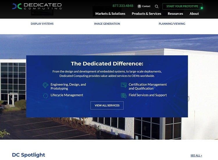 Dedicated Computing places its contact button in the upper right corner. Clicking it provides locations and a contact form, as well as a toll-free number. This information makes the user feel the company is trustworthy.