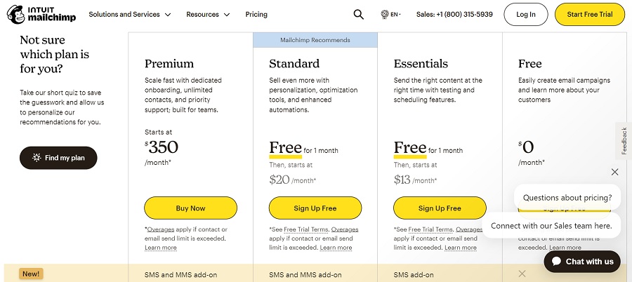 All of the paid packages come with email scheduling, ability to remove Mailchimp branding and A/B testing. Essentials and Standard packages offer a one month free trial.