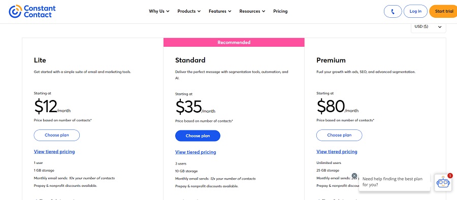 Constant Contact offers three tiers of pricing. The Lite plan starts at $12 per month with one user and one GB storage. The cost varies, based on how many subscribers you have. The next plan up is Standard, which adds in segmentation tools and automation for $35 per month to start and 10 GB storage. The Premium plan runs $80 per month for the lowest tier of subscribers and gives you unlimited users and 25 GB storage.