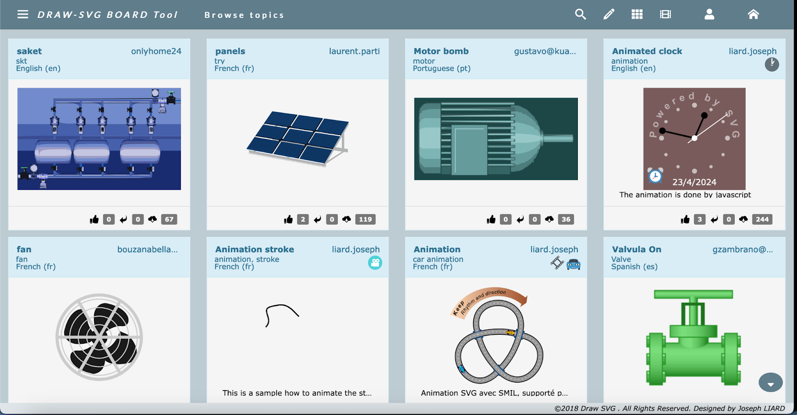 The above example shows how people from various countries use the application. Whether someone is brand new to SVG creation and editing and wants to see the possibilities or wants help overcoming an artistic block, the Drawing Board is an excellent starting point.