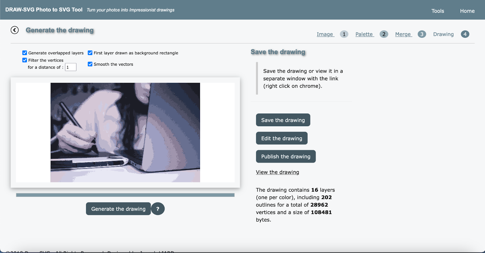 The results after generating the drawing provide a visually striking but muted result. People can also tweak the color palette. However, the above example arose from not making the generated image’s colors different from what the original photo contained.