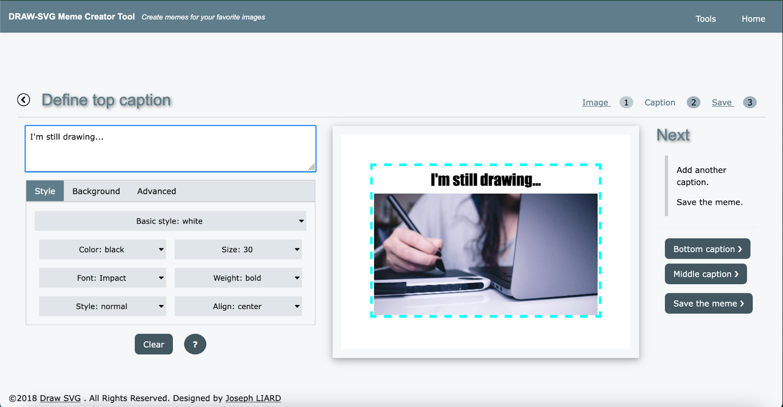 The three-step process outlined on the top right is also a handy visual indicator of what you still must do to create a meme. The first step was to upload an image, which can be one recently made with DRAW-SVG or otherwise saved on a computer’s hard drive.