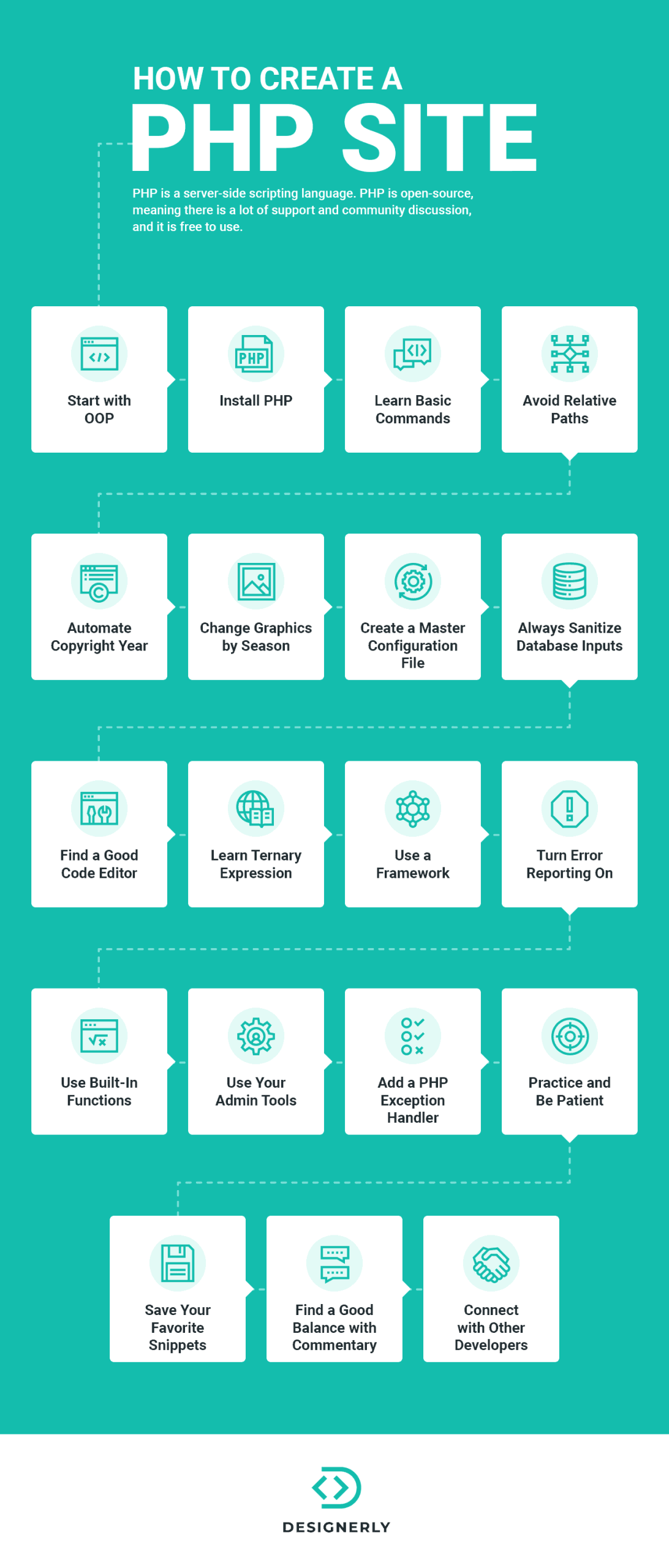 Before you dive right into PHP and trying to learn a new coding language, gain a background in OOP, which stands for object-oriented programming — the foundation of PHP. By learning the basics of OOP, you begin to understand PHP, and can then move on to more advanced topics. Take an online course, such as Object-Oriented PHP for Beginners, at Tuts+.