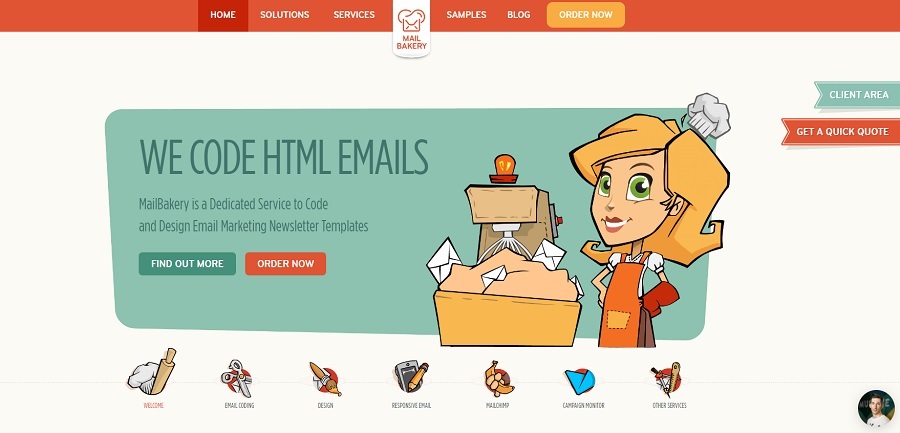 Mail Bakery pulls in a gorgeous split complementary color scheme by adding a block of green behind the hero image and then weaving in red and yellow throughout. You’ll also see pops of orange, such as in the top navigation bar.