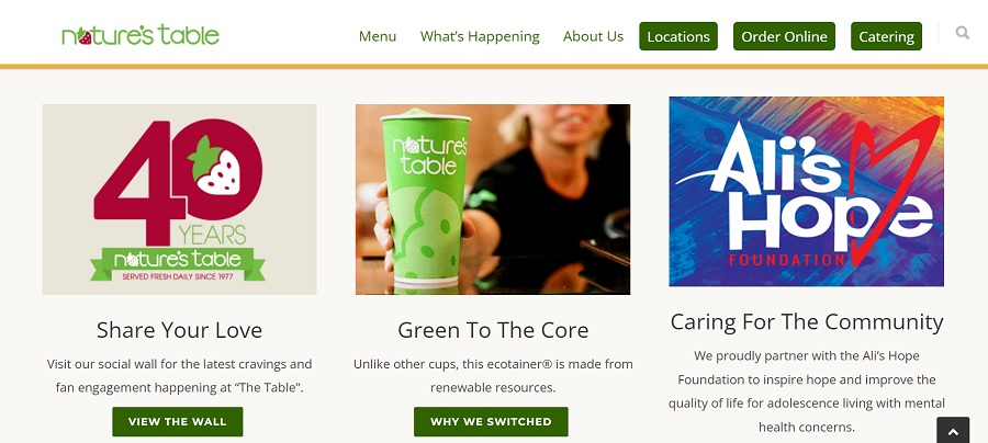 Nature’s Table uses a split complementary color scheme with plenty of white space to offset the bold pops via the photos and typography. Note how they incorporate just a bit of red into their logo and repeat it in one of their headline images. There is also blue and green throughout. Because they can easily swap out any box, it’s easy for them to shift and focus on one color more than another.