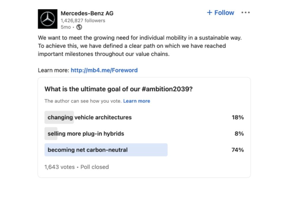 LinkedIn offers various formats to diversify a content strategy. Business leaders often use LinkedIn articles, polls and live sessions to build thought leadership and engagement. Take note of the following post by Mercedes-Benz. The luxury car company uses a poll to interact with followers and increase engagement.