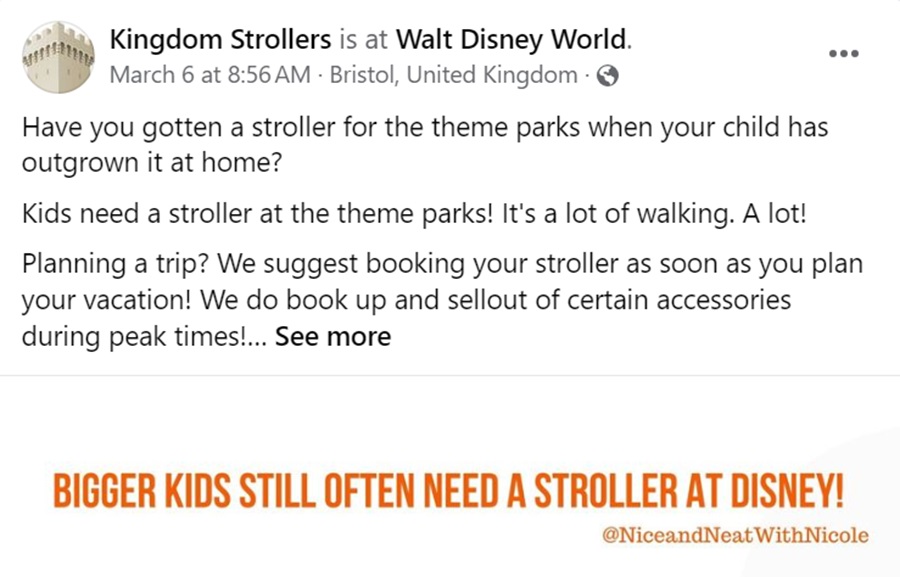 Consider what your audience cares about. What are their pain points and how can you solve them? One example is Kingdom Strollers’ Facebook page. They know that parents spend a lot of money when they take their kids to Disney. Those kids get tired of all the walking. To keep the experience magical, a stroller comes in handy, so they remind parents of this handy fact.