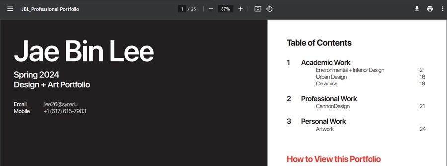 This portfolio is quite unique in looking more like the chapters of a book at first glance. As you move through the site, you see a layout that looks like a title page and copyright information. Look a bit closer and you see the chapter headers are for his education, professional work and personal passions.
