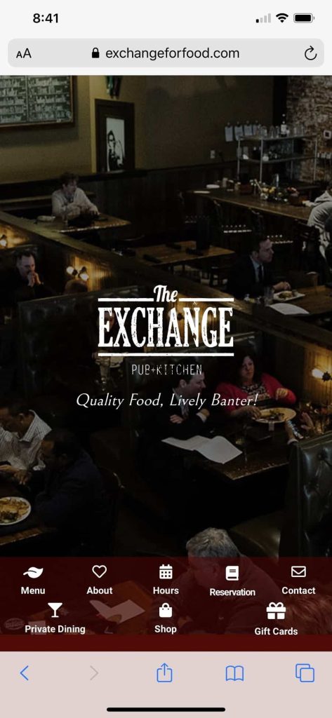 In addition to a mobile responsive design, The Exchange Pub+Kitchen website also features gorgeous photography. The focal point of the image is their food. Everything else fades into the background. The visuals send a strong message to site visitors.