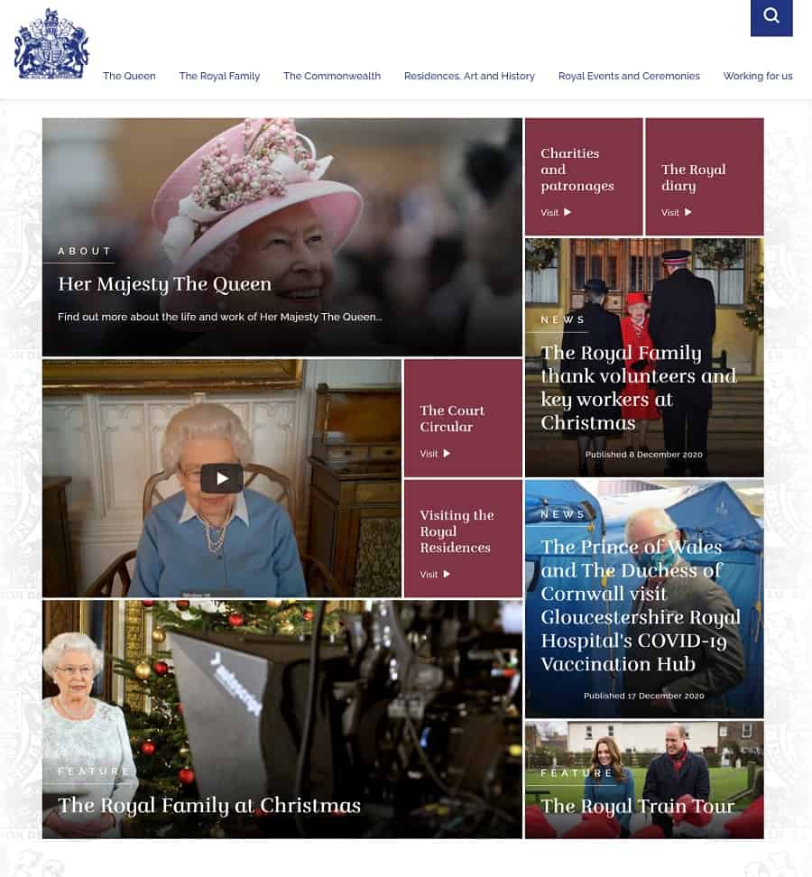 The website is set up like a magazine, featuring links to news, videos and updates. Other site areas include virtual tours of the royal residences and even information on working for the family.