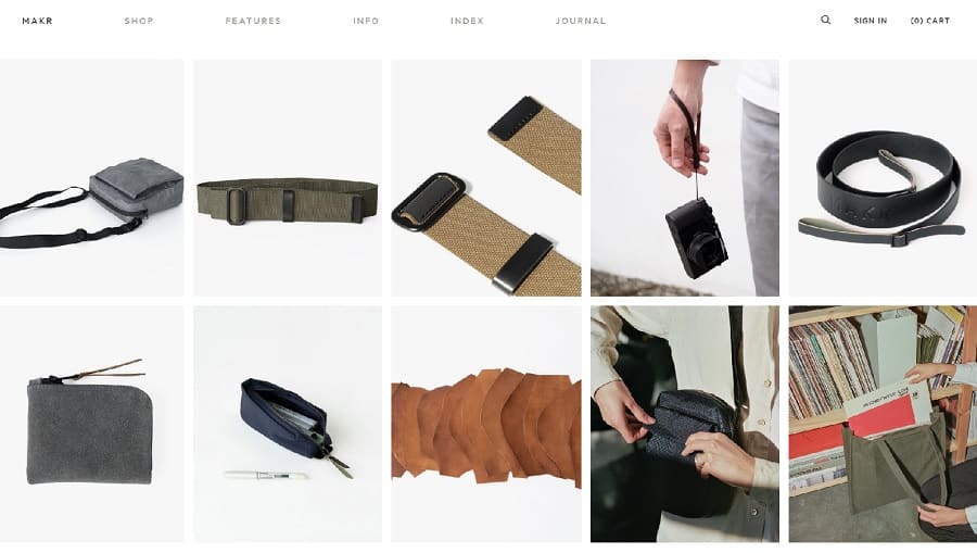 MAKR is a design studio creating goods from natural materials such as leather. The simple grid layout of their design utilizes colors you’d find in nature with a black and white palette. Note how the images within each box tend to use earth tones. Only one image has a pop of color to grab attention and break up the monotony a bit.