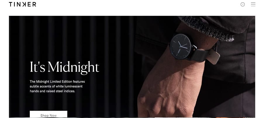 Tinker Watches sticks to a monochromatic color scheme. Their navigation offers only the bare minimum, and they have a single CTA button above the fold. Even the images on the landing page are honed in on the watches and nothing else.