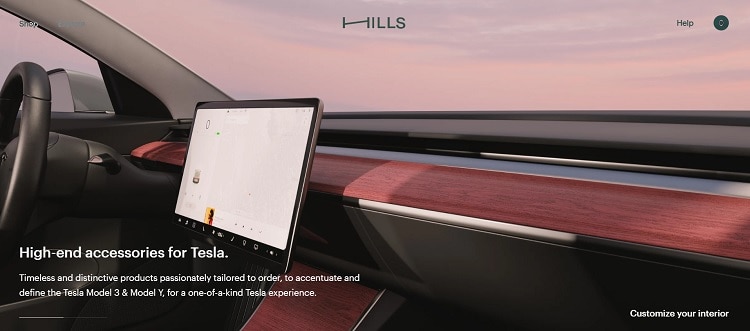 Hills makes high-end accessories for Tesla vehicles. Their website design places the focus on one of their products by placing it in the left middle grid. The rest of the screen is filled with the background of a vehicle interior and sky. This puts the attention on the item they’re trying to sell.