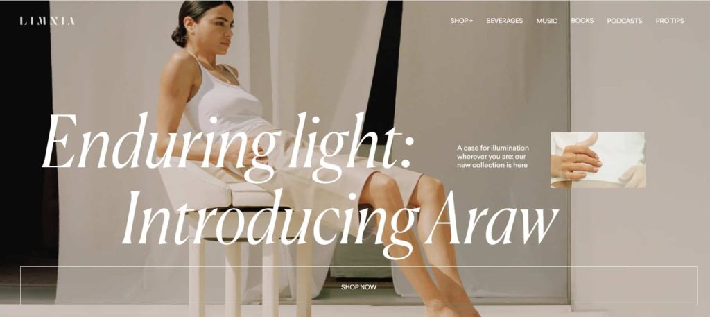 Limnia utilizes the Rule of Thirds. They add an image of a model stretched out across three of the grids moving downward. They leave white space around for a look drawing the eye across the clothing the model wears and to the large CTA button reading “Shop Now.”